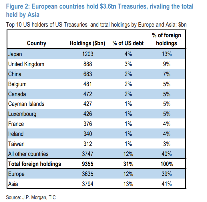 但是,摩根大通在其分析中指出了这一恐慌逻辑的致命缺陷。该行认为,亚洲和欧洲持有美债的性质存在根本差异。中国和日本合计拥有超过4.5万亿美元的储备资产,其美债持仓主要反映了官方(政府)的意志。相比之下,欧洲的官方储备规模要小得多。、