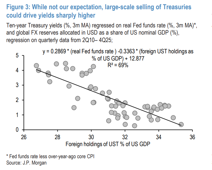 毕竟,数据显示欧洲国家总共持有3.8万亿美元的美国国债,这一规模足以与亚洲国家的持有量相匹敌。摩根大通的模型显示,如果外国持有的美债占美国GDP的比例每下降1个百分点(约3000亿美元),5年期美债收益率往往会上升超过33个基点。