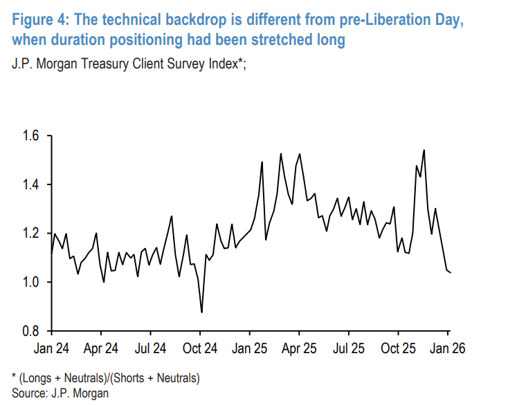 除了持仓结构,摩根大通认为当前的技术面背景也为美债市场提供了一层保护垫。在此前的“解放日”冲击前,市场普遍担忧经济衰退,导致投资者在久期上过度做多,仓位极度拥挤。当风向从衰退转为滞胀担忧时,这种拥挤的多头仓位引发了踩踏式的平仓,导致长端收益率飙升。