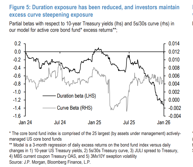 该行的核心债券基金模型也发出了类似信号,久期贝塔值在1年期的Z分数基础上接近-2。这意味着,市场目前并没有大规模的多头头寸需要平仓。摩根大通指出,主动型核心债券基金目前相对于基准维持了显著的曲线陡峭化敞口,这进一步限制了投资者削减长端敞口的风险。简而言之,市场已经提前“防御”了,这使得收益率进一步大幅飙升的动能减弱。