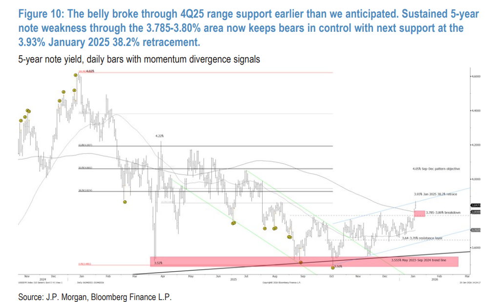最后,摩根大通对技术图形发出了严厉的警告。该行技术分析指出,5年期美债收益率已经跌破了关键的支撑区域(3.785-3.80%),这一破位发生的时间比该行预期的更早。摩根大通强调,这次破位意味着空头已经完全掌控了局势。随着这一关键防线的失守,5年期美债收益率的下一个有意义的支撑位将直接指向3.93%,即2025年1月行情的38.2%回撤位。只要市场价格无法重新收复3.785-3.80%的失地,看跌的趋势动能就将保持完好。