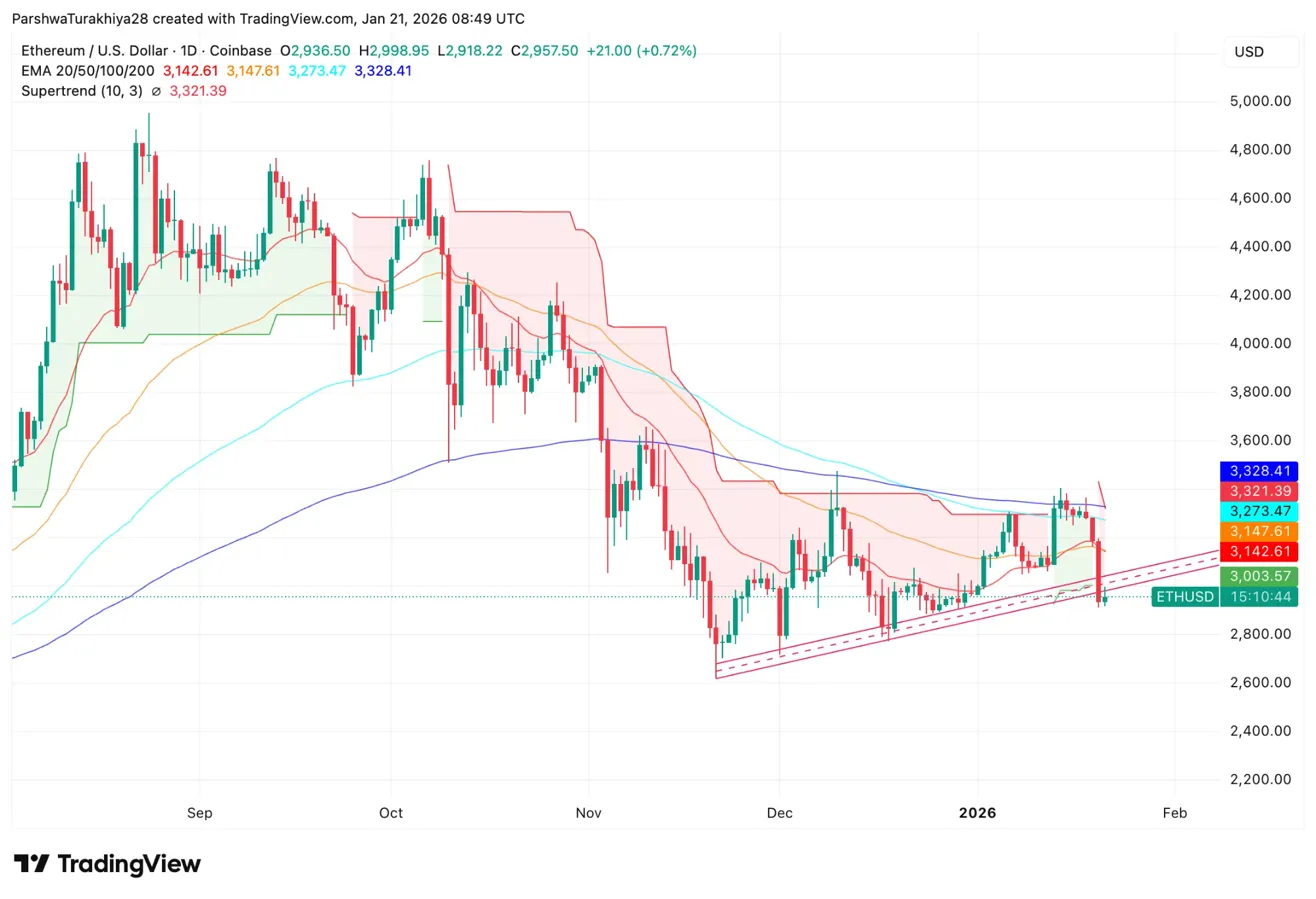 以太坊价格今日交投于 2957.50 美元附近,此前已跌破自去年 12 月低点以来一直支撑价格走势的下降通道。这是自去年 12 月初以来首次收于 3000 美元以下,即使机构买家入场,技术形态仍转为看跌。