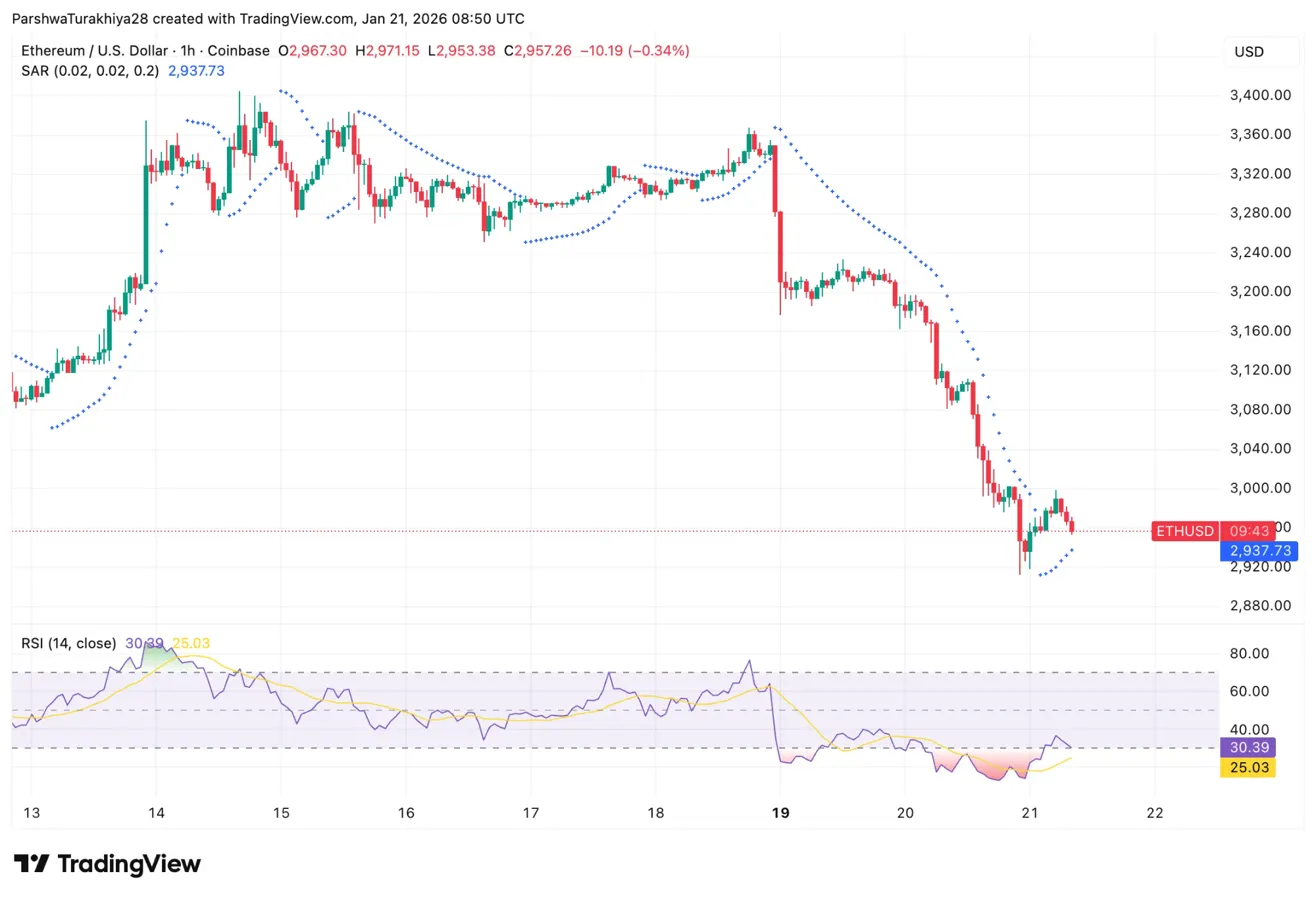 较短的时间周期更能体现此次下跌的严重程度。在小时图上,ETH 在短短三个交易日内就从 3,370 美元跌至 2,920 美元的低点。抛物线转向指标 (Parabolic SAR) 位于 2,937.73 美元,略低于当前价格,这表明短期下跌趋势可能即将暂停。