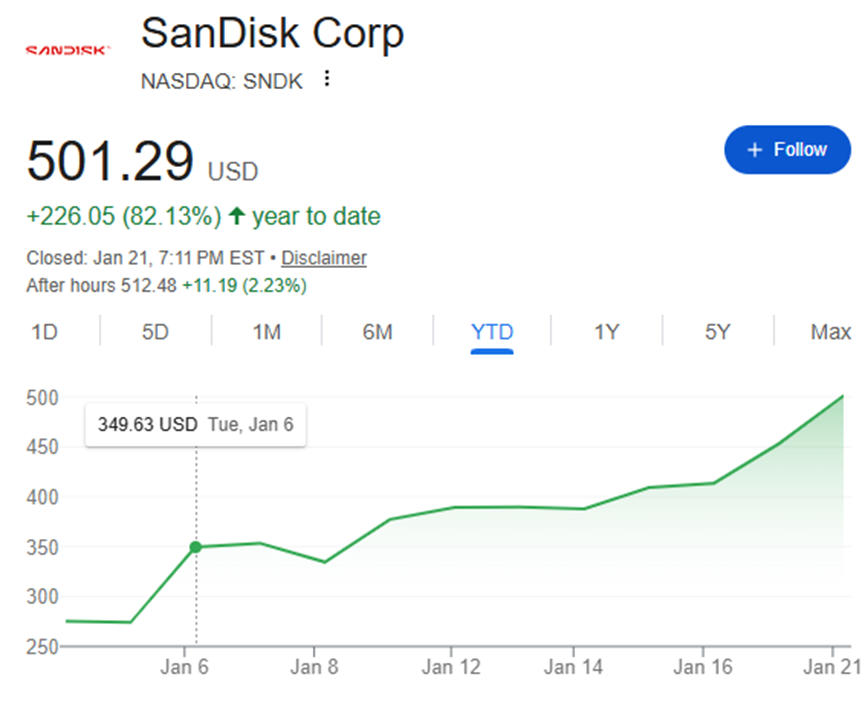 作为近期美股科技板块的领头羊,闪迪展现出惊人的爆发力。自2025年2月从西部数据分拆上市以来,其股价涨幅已超过10倍。进入2026年仅11个交易日,闪迪股价已累计上涨超82%,被Zacks Investment Research称为“2026年最值得追捧的科技股”。