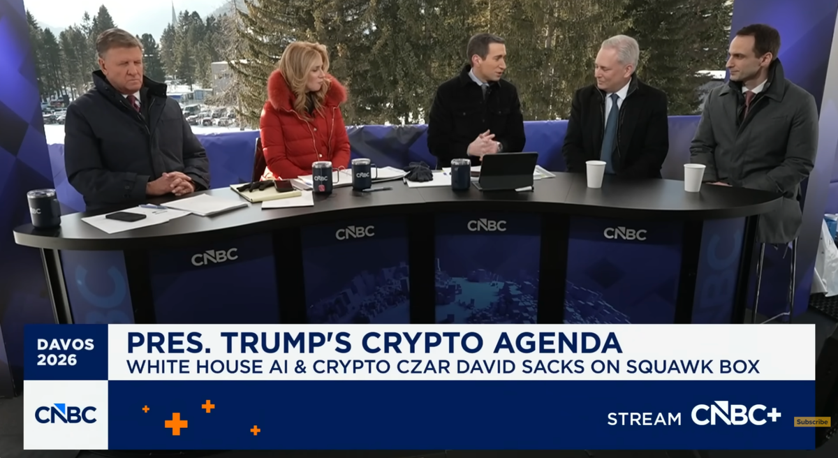 Sacks是在瑞士达沃斯世界经济论坛(WEF)期间接受CNBC《Squawk Box》节目采访时发表上述讲话。当时他被问及关于拟议的CLARITY法案的谈判进展,该市场结构法案因围绕稳定币发行方是否应被允许提供收益的争议而陷入停滞。
