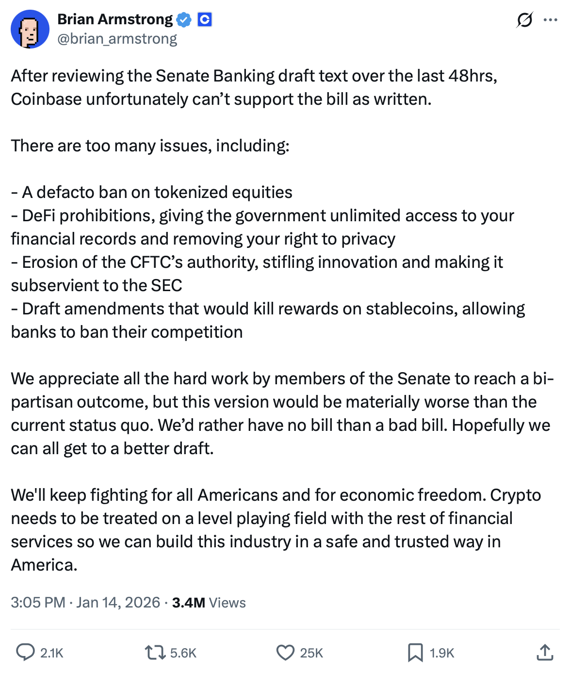 Coinbase首席执行官Brian Armstrong在X上表示,目前该法案草案“问题太多”,不予支持,理由包括取消稳定币收益,同时又让银行免于竞争。目前法案草案存在太多问题,包括消除稳定币收益,并让银行避免竞争。