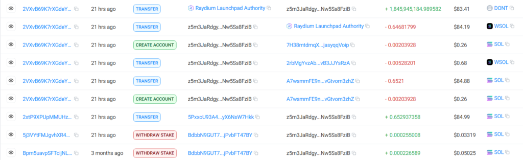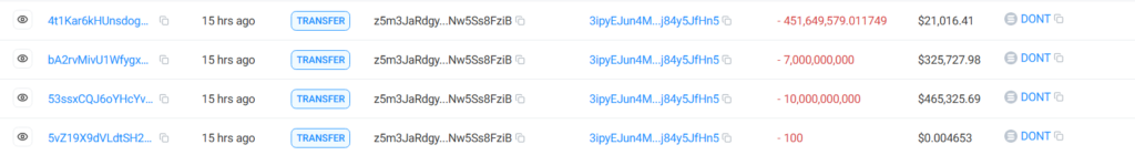 后来的一些交易甚至更加令人印象深刻。在首次买入约五个小时后,该交易员通过连续四笔交易抛售了超过170亿枚DONT,获利超过80万美元。