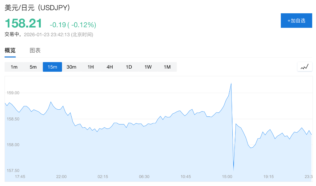 1月23日,日央行维持政策利率不变,但上调经济增长预期并释放出未来可能进一步加息的信号。然而,这一偏鹰派立场并未能阻止日元走软,美元兑日元一度逼近160的关键心理点位,随后汇率突然大幅上涨,引发了市场对官方干预的广泛猜测。财政大臣片山皋月对此未正面回应。