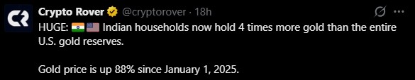 这一庞大的私人黄金持有量凸显了印度对黄金的文化依赖,以及黄金作为抵御通胀和不确定性的经济缓冲工具的作用。自2025年1月以来,黄金价格已飙升88%,分析师们对此表示担忧。预测未来增长到 2026 年底,价格将达到每盎司 5400 美元。