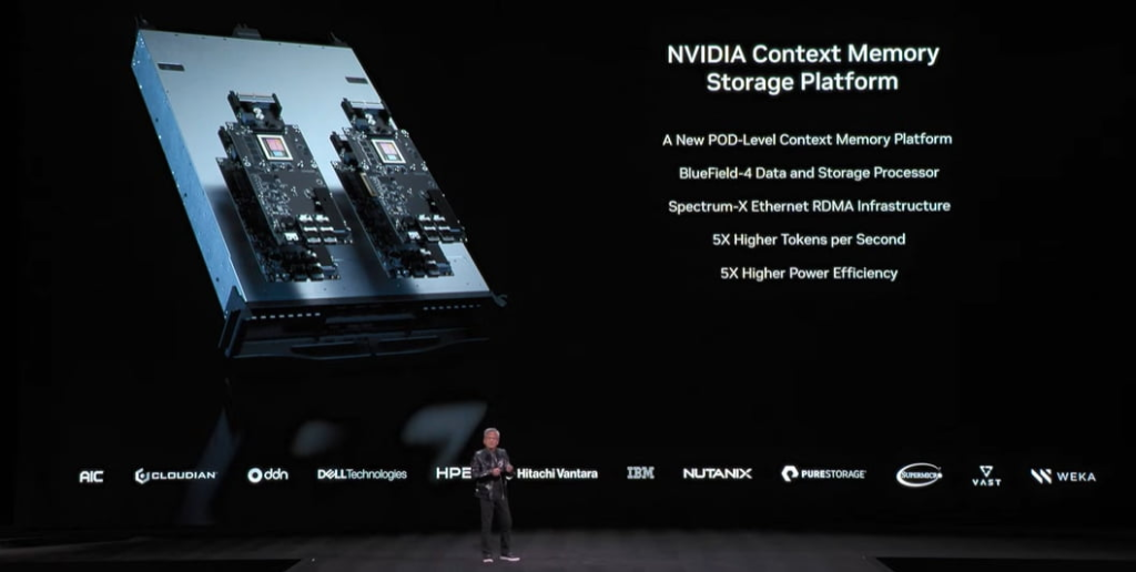 NVIDIA CEO 黄仁勋在 CES 2026 上推出 ICMS。图片由 NVIDIA YouTube 提供。DPU + 超大容量 SSD = KV 缓存存储专用团队