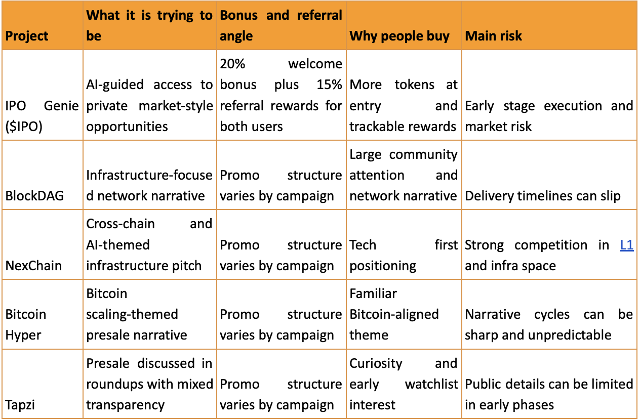 期货发布更新, 和竞争为了吸引眼球。然而,计划购买的参与者想要更实用的东西。他们想要清晰明了的信息。入门数学,明确的奖励规则沙一种方式 核实付款后发生了什么?本文正是为此目的而作。它公正地评述了几个热门类别,然后解释了原因。IPO Genie($IPO)不断出现顶级加密货币预售活动,提供额外奖励的加密货币预售易于理解且易于衡量。本文使用简单的示例和公开的程序规则,同时指出预售仍然存在高风险。