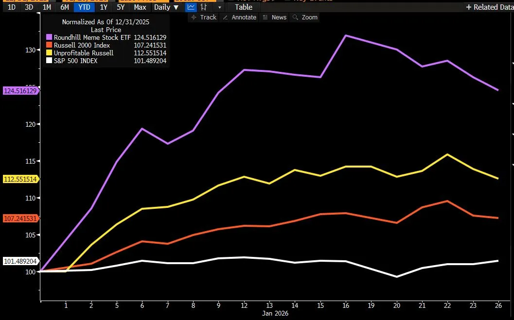 通常情况下,当整个美国政治经济笼罩在不确定性之中时,投资者会涌向传统的避险资产,例如美国国债或高股息股票。但现在的情况并非如此。除了黄金(它本身就像一只单边上涨的“梗股”)之外,市场中最具投机性的板块的表现都优于基准指数。“梗股”和小盘股的表现都超过了标普500指数。甚至那些尚未盈利的小盘股,现在也跑赢了罗素2000指数。