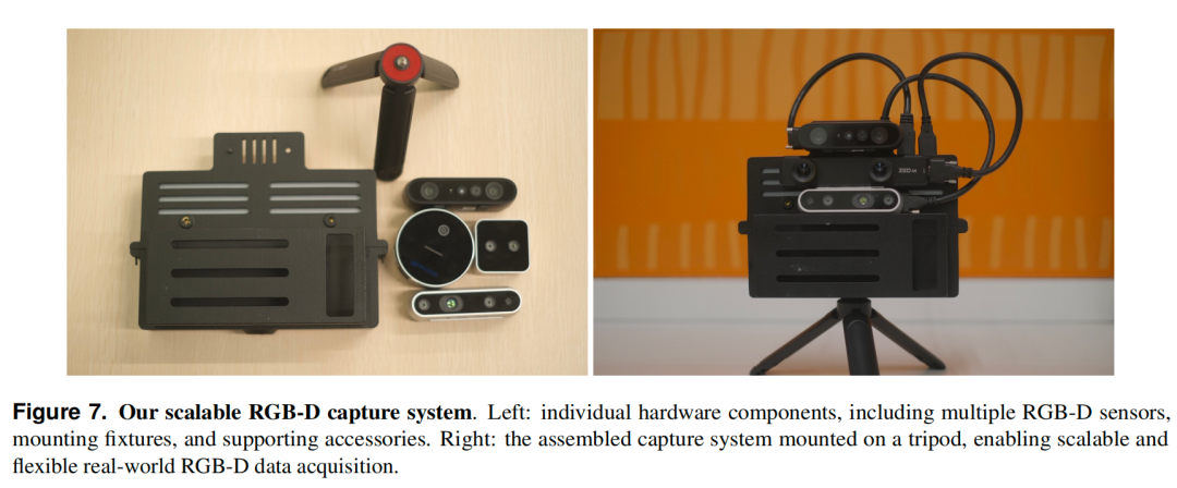 在真实数据方面,团队设计了一套模块化的3D打印采集装置,可以灵活适配多种商用RGB-D相机(如Orbbec Gemini、Intel RealSense、ZED等)。