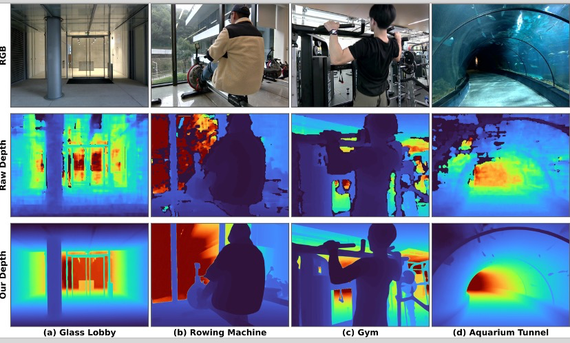在一段包含玻璃大门、有镜子和玻璃的健身房、海洋馆隧道的视频中,LingBot-Depth 输出的深度流不仅填补了原始传感器的大片空洞,而且在整个视频过程中保持平滑、稳定,没有任何闪烁或跳变。