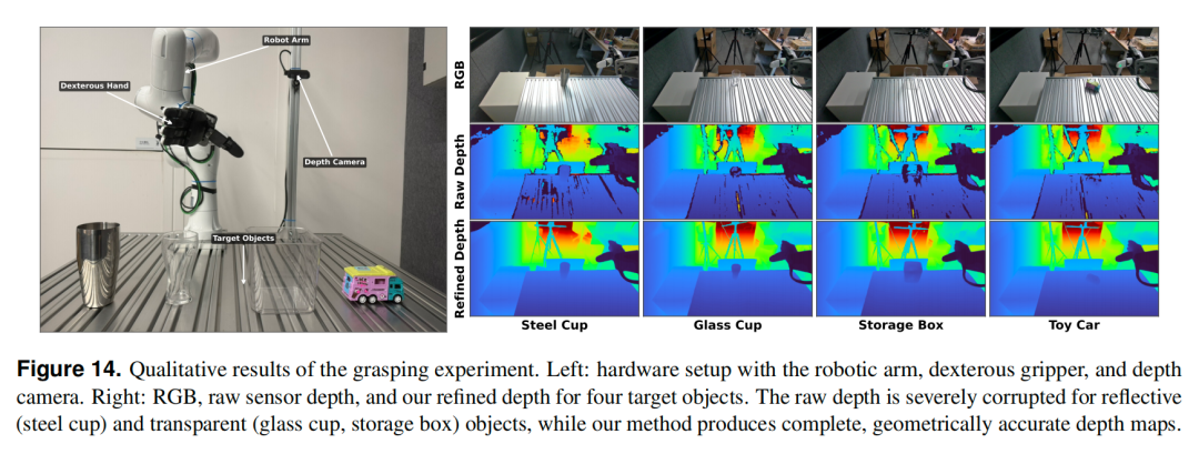 实验目标是抓取一系列对深度感知极具挑战的物体:不锈钢杯、透明玻璃杯、透明收纳盒和玩具车。