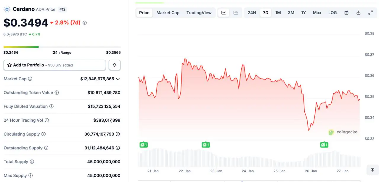 “>EVM专家们认为,ZKP 具有兼容性,并制定了以 1000 TPS 为目标的路线图,这是一个高风险、高回报的项目,未来几年将受到实际使用量增长的影响。卡尔达诺 (Cardano) 近期价格下跌后,目前仍在 0.35 美元至 0.39 美元区间波动,市场情绪谨慎。关注卡尔达诺价格预测的分析师指出,ADA 近期测试了 0.35 美元至 0.37 美元附近的支撑位,许多人认为该区域对维持价格稳定至关重要。