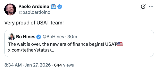 “Tether为机构用户提供了又一选择——一款在美国制造、以美元为支撑的代币,”Tether CEO Paolo Ardoino表示。