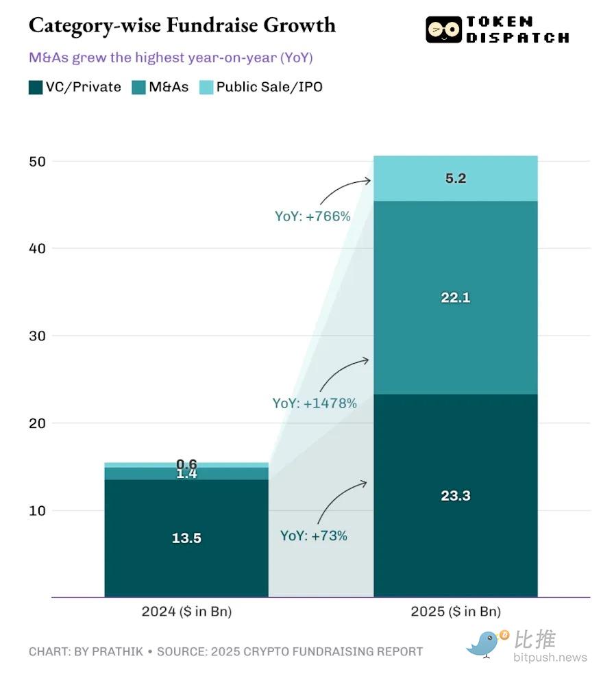 去年筹集的资金中,超过40%来自并购(M&A),而2024年这一比例仅为9%。尽管总融资额比前一年增长了两倍多,但2025年更多是加密货币行业的整合之年。