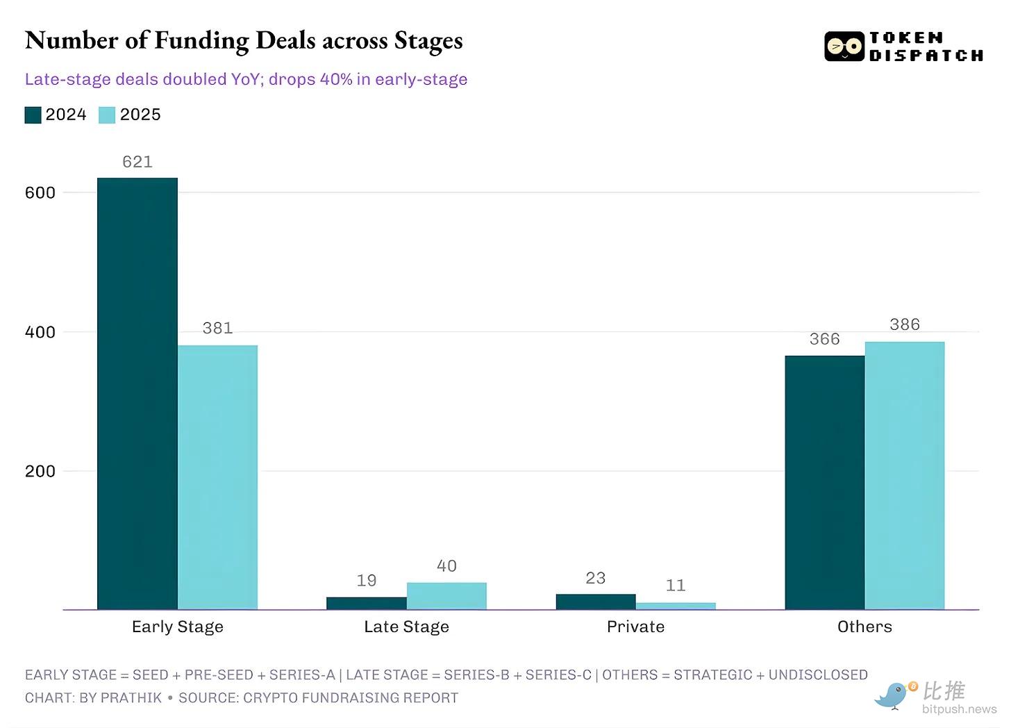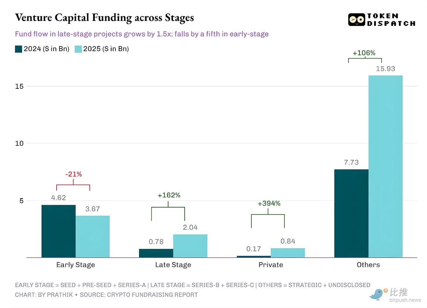 2024年,VC占总融资额的85%以上,而到2025年,这一比例下滑至46%。这一点,结合VC去年在加密项目不同阶段的资金分配方式,正是令新一代加密开发者和创始人感到担忧的地方:2025年,VC签署的支票数量少得多,但金额更大,目的是资助处于生命周期后期的现有项目,而不是资助更新的早期项目。