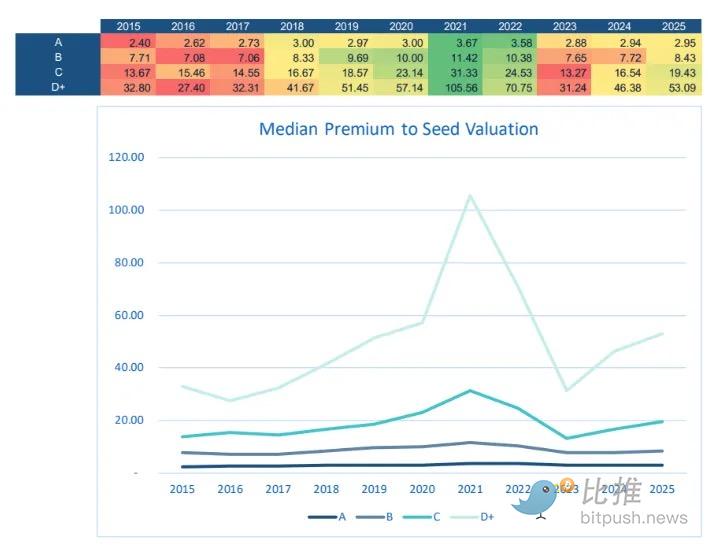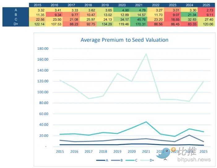 这种转变促使理性的资本分配者将资金重新分配到风险较低的机会中,例如A轮和B轮项目,这些项目要求的估值溢价低于种子轮、种子前轮、C轮及D+轮。