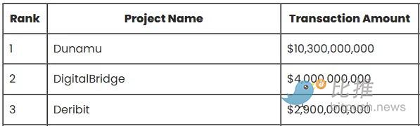 以报告中列出的前三大并购交易为例:Dunamu、DigitalBridge 和 Deribit。它们的总额达172亿美元,约占报告总并购价值的81%。