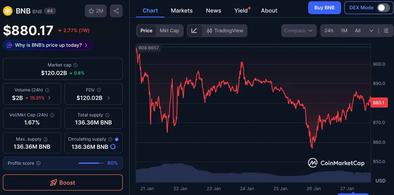 股价为 880 美元,市值达 1200 亿美元。BNB通过整合保持领先地位去中心化金融