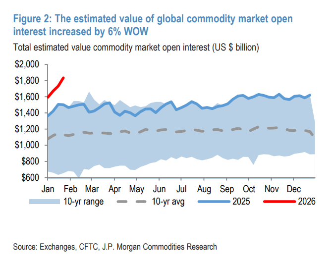 截至2026年1月23日的一周内,全球大宗商品市场的未平仓合约估值周环比增长近6%(约增加1010亿美元),达到1.83万亿美元。