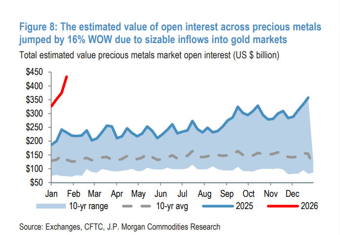 因此,截至1月23日当周,贵金属市场未平仓合约价值环比大增16%(约590亿美元)至4330亿美元,成为当周贡献最大的单一板块。
