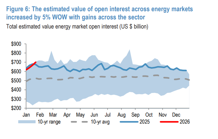 能源市场方面,未平仓合约价值周环比增长4.8%(增加320亿美元)至7000亿美元。