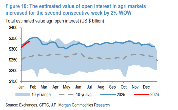农业板块同样获得资金青睐。数据显示,全球农产品市场未平仓合约价值当周环比上升2.4%,至约3370亿美元。这一增长由全板块89亿美元的合约净流入驱动,谷物、油籽和牲畜市场的价格上涨抵消了软商品市场的价格下跌。