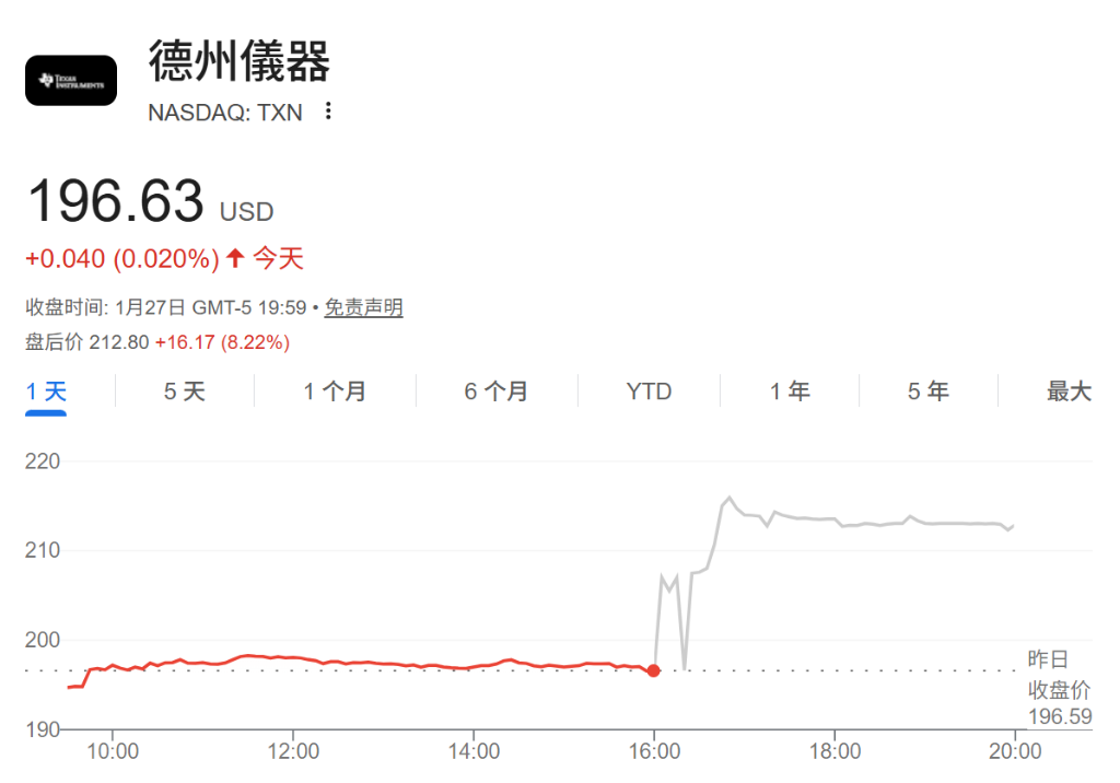 德州仪器周二盘后跳涨8%。公司财报给出乐观指引,预计第一季度营收为43.2亿至46.8亿美元,按指引中值计算,将高于第四季度营收44.2亿美元。