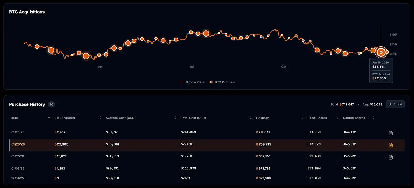 根据 Bitcoin Strategy Tracker 数据显示,仅在 2026 年 1 月份 Strategy 便购入了超过四万枚比特币。尤其在 1 月 6 日至 1 月 20 日短短两周内,分两批次累计购入 35,932 枚比特币,买入均价落在 91,500 美元至 95,300 美元区间。统计显示,Strategy 在 1 月份的总投入资金高达 37 亿美元;截至 1 月 27 日,其资产负债表上已累积持有 712,647 枚比特币,整体平均购入成本为 76,038 美元。