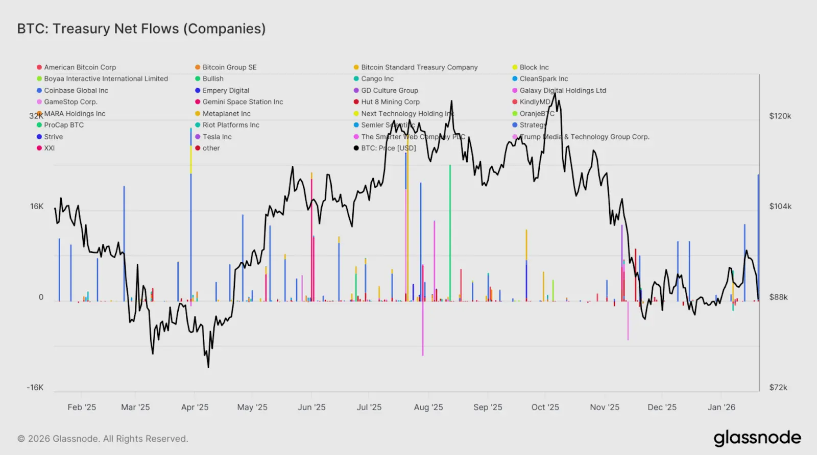 比特币财库资金零星流入、不均衡:Glassnode 报告指出,近期的企业资金流入主要集中在个别事件驱动的交易中,而非普遍的资金累积。下图可以发现,买盘主要为 Strategy 驱动,而其他比特币财库公司在近期并没有进一步购入,与 2025 年 5 月至 8 月份多个财库公司协同买入、推动趋势加速的盛况形成鲜明对比。