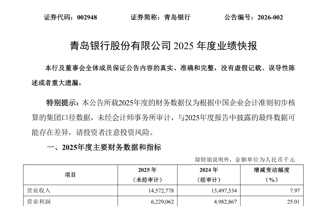 业绩快报显示,青岛银行2025年实现营业收入145.73亿元,同比增长7.97%实现;营业利润62.29亿元,同比增长25.01%,利润增长快于营收。