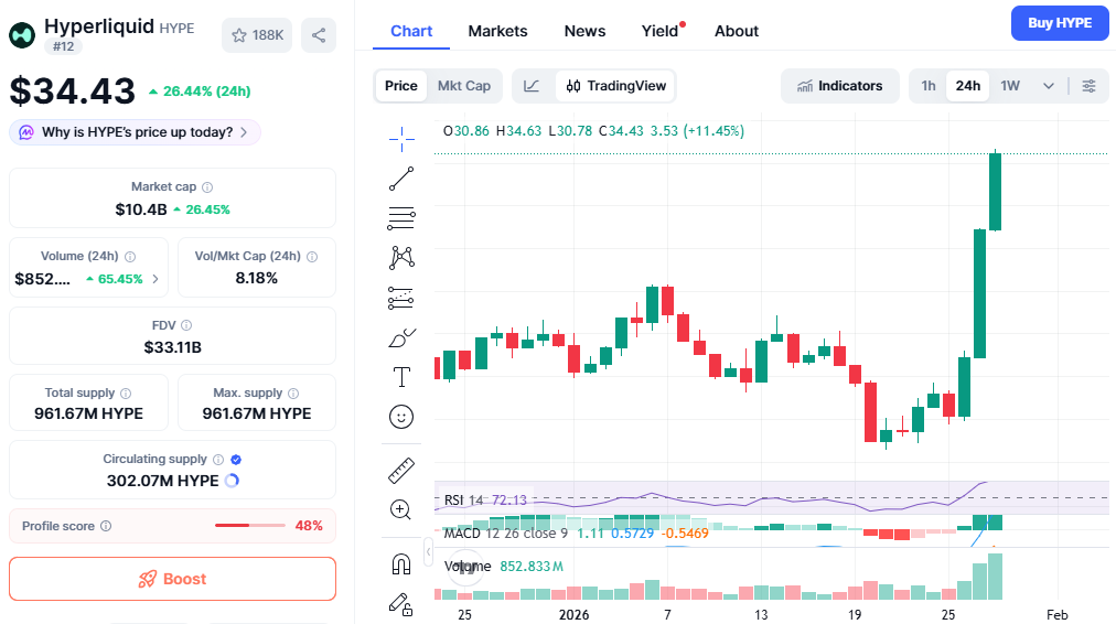 Hyperliquid 的价格飙升令加密货币市场震惊,HYPE 代币突破了 34 美元大关。在过去 24 小时内,HYPE 的价格上涨超过 24%,这清楚地表明其表现优于整体加密货币市场。这一强劲走势使 Hyperliquid 的市值逼近 100 亿美元,并使其成为目前最受关注的项目之一。