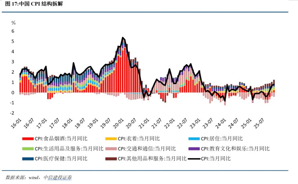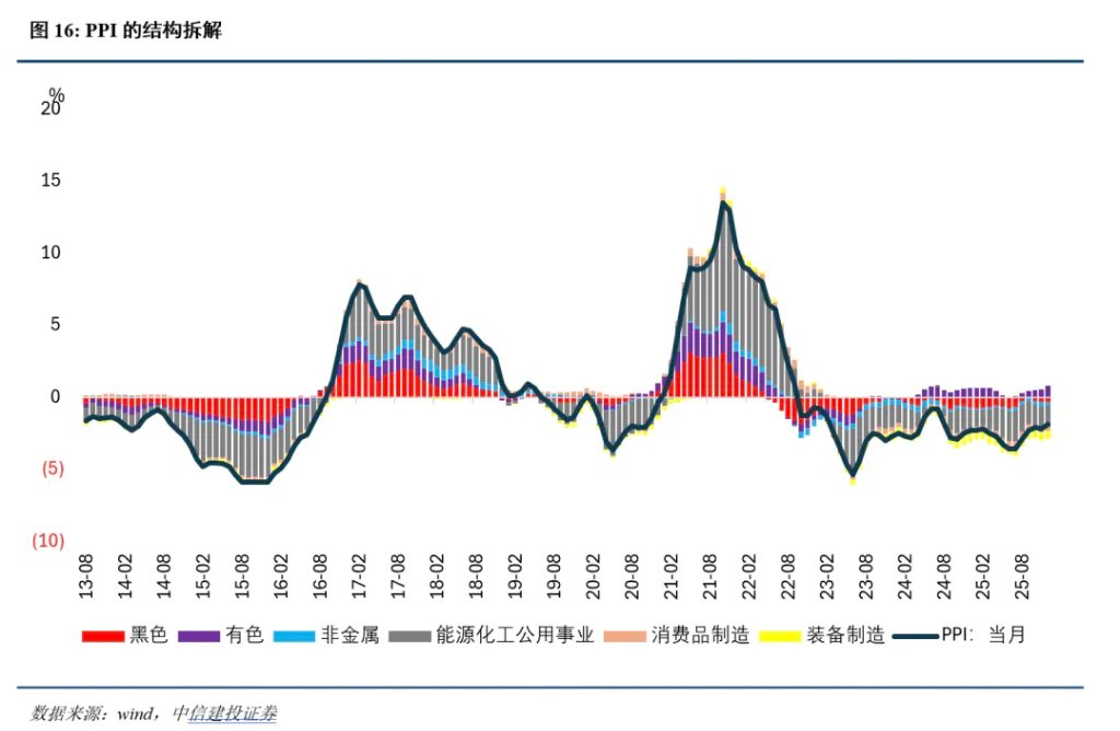 一方面,旧动能的退潮带来了需求侧的通缩压力。 随着地产“黄金时代”的落幕,地产链条面临深度去库存,房价下行引发的负财富效应抑制了居民的可选消费意愿,这是导致当前CPI与PPI总指数偏弱的核心拖累项。