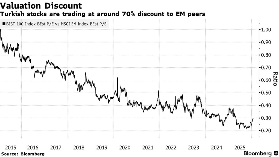 以美元计价,伊斯坦布尔100指数1月至今已上涨19%,为1997年以来同期最佳表现。即便经历本轮上涨,以预期市盈率衡量,土耳其股市相较于其他新兴市场股票仍存在显著估值折让。