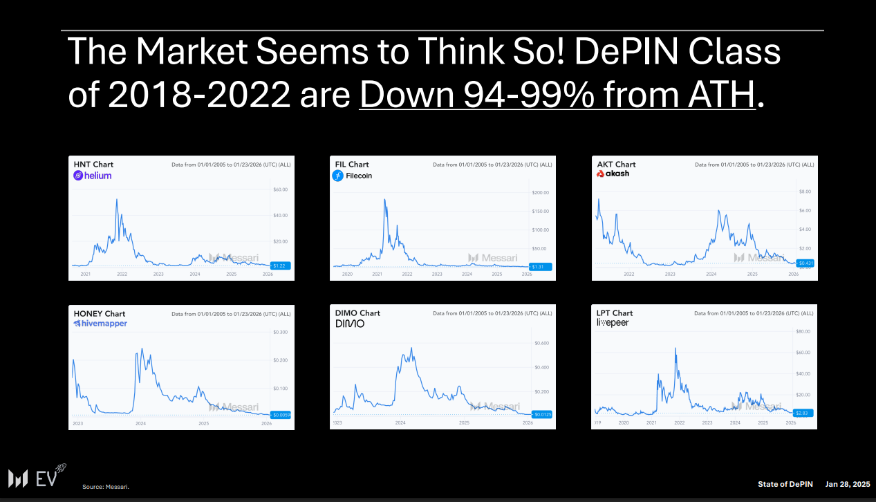 根据报告,2018-2022年启动的DePIN代币距历史高点已普遍下跌94%至99%。然而,领先项目如今已实现可验证的经常性收入,并以收入的10至25倍估值交易,相较于增长水平,Messari认为该估值处于被低估状态。