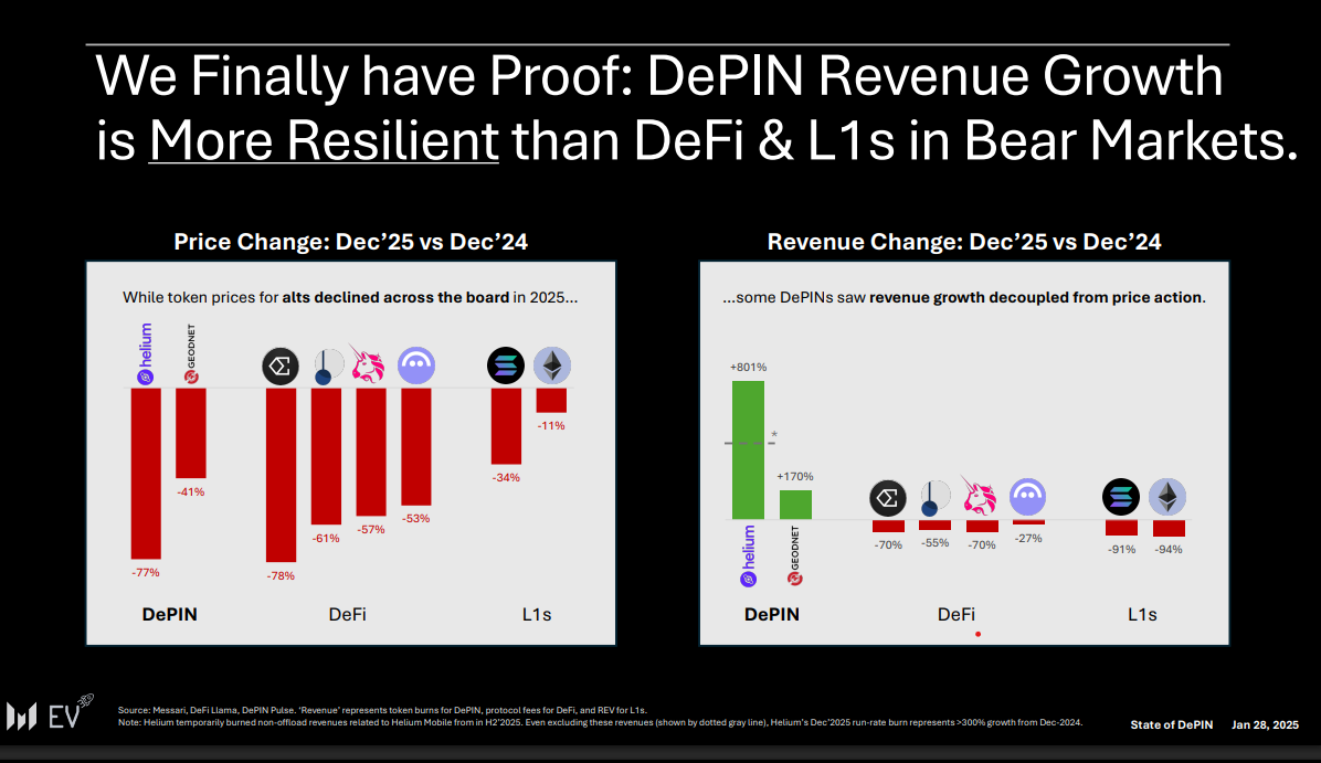 尽管Helium(HNT)和GEODNET(GEOD)等DePIN代币在2024年12月至2025年12月期间分别下跌77%和41%,但同期二者的链上收入分别增长约8倍和1.7倍,对比来看,主要DeFi协议和智能合约链则出现了严重收入下滑。
