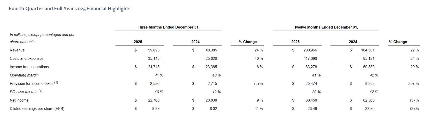 唯一显得「逆行」的是全年净利润录得 604.58 亿美元,同比下降 3%,但这一变化并非主营恶化,而主要源于一次性税务因素——受《大而美法案》影响,公司确认了约 160 亿美元的一次性非现金所得税支出。