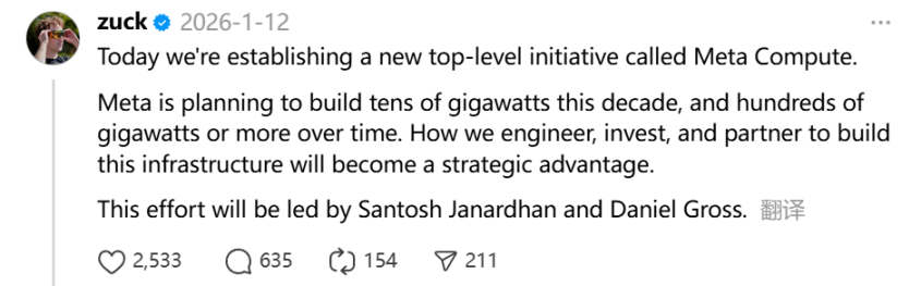 更具战略意义的,是 Meta 对算力与基础设施的重新定级。扎克伯格 1 月 12 日亲自发帖,表示「启动了一个名为 Meta Compute 的全新的最高级别战略项目」,按照披露信息,Meta 计划在 2028 年前,在美国的数据中心与相关基础设施上累计投入至少 6000 亿美元。