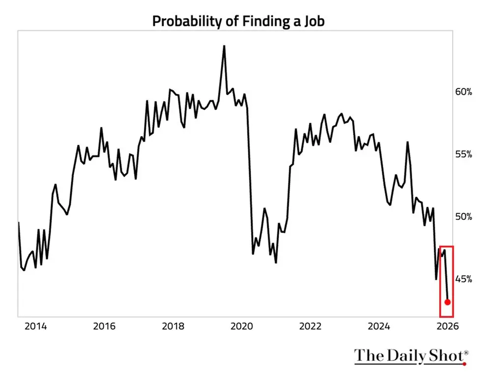 最新数据显示,人们普遍认为失业后三个月内找到新工作的概率已降至43.1%,创历史新低。这比2022年5月下降了约15个百分点,甚至低于2020年疫情高峰期46.2%的低点。