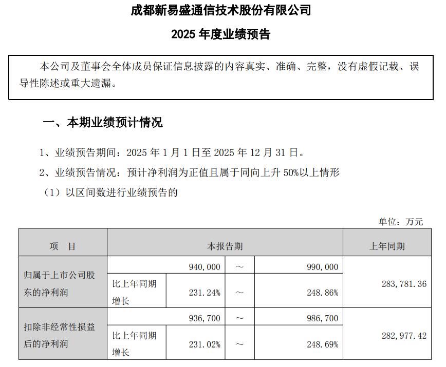 新易盛预计2025年度归属于上市公司股东的净利润在94亿元至99亿元,同比大幅增长231.24%至248.86%。扣非净利润区间显示同样强劲的经营性表现,显示经营性增长动力强劲。