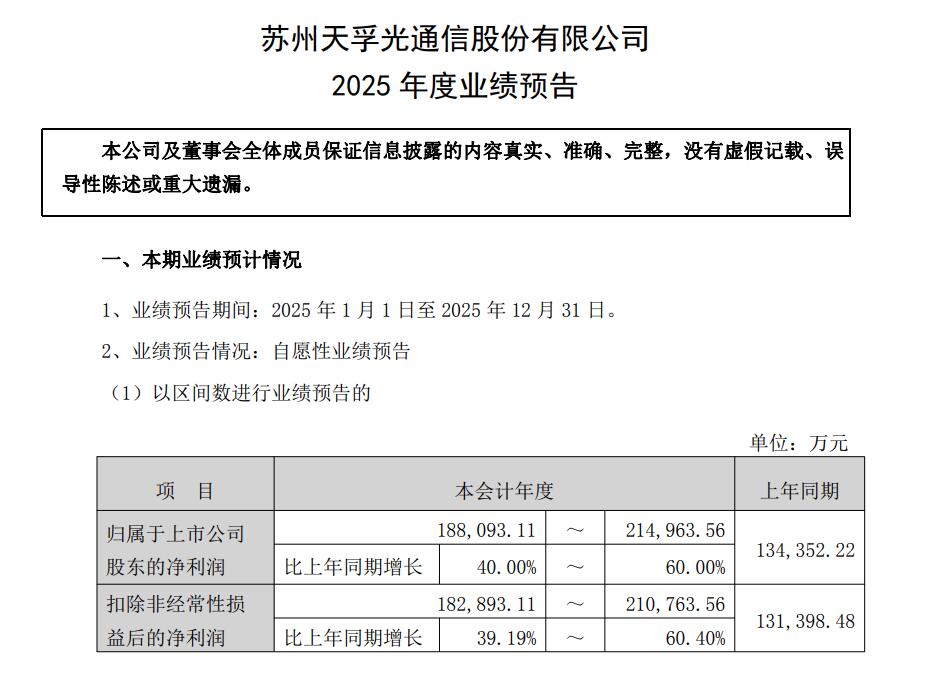 天孚通信2025年业绩预告显示,公司预计净利润在18.81亿元–21.50亿元之间,同比增长约40%–60%,扣除非经常性损益后的净利润也同比增长近同一幅度。