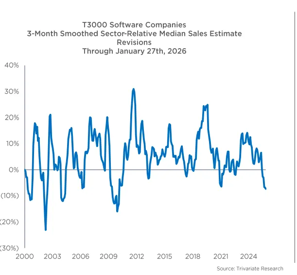 部分问题在于,任何希望财报季能够缓解软件投资者紧张情绪的人都大失所望。许多软件公司都在下调未来营收和盈利预期。事实上,据 Trivariate 的数据显示,自 2009 年金融危机以来,我们从未见过软件公司销售额预期中位数相对于整个科技行业出现如此大幅度的下调。