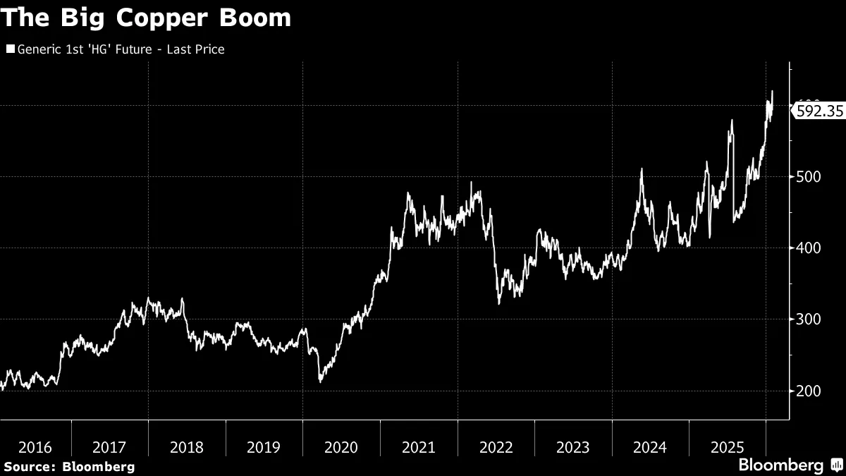 但故事不仅仅关乎数据中心。地缘政治和自由贸易的瓦解也推高了金属价格。欧洲将斥资数万亿美元发展国防工业,这显然需要消耗大量资源。与此同时,由于国家间贸易受到威胁,各国面临着囤积工业商品的压力,即便这些商品目前并未投入使用。