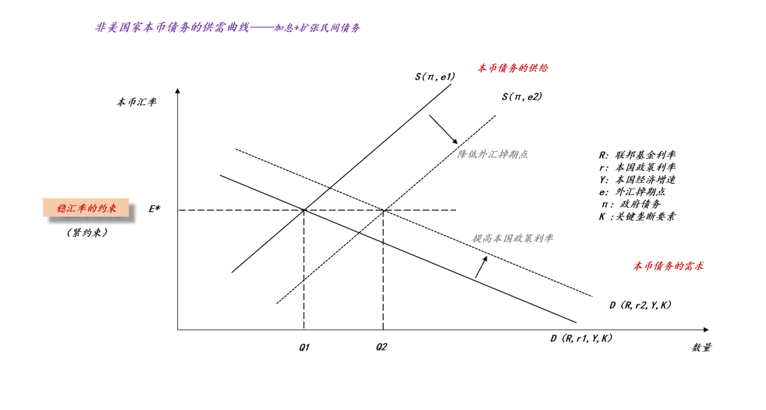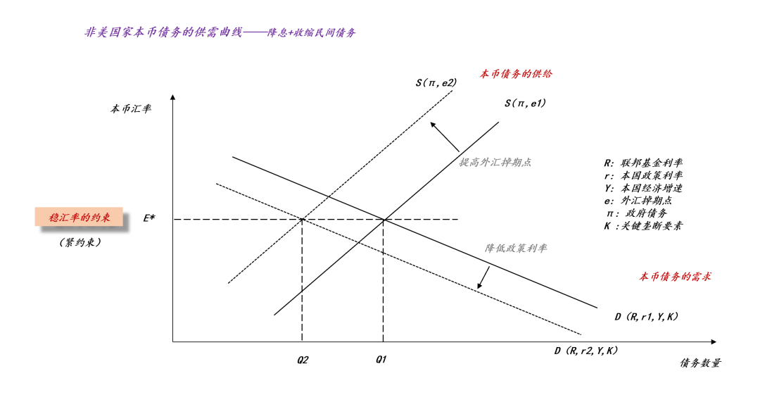 对称的,如果一个非美国家想要降低本国的政策利率r,以减少政府的债务增长,那么,他必须考虑到降息的负面作用,即它会导致本币需求曲线从D(R,r1,Y,K)收缩为D(R,r2,Y,K)。由于保持汇率E*不变是紧约束,所以,降息是要支付对价的——他需要想办法收缩民间债务,让本币债务的供给曲线从S(π,e1)收缩到S(π,e2)。