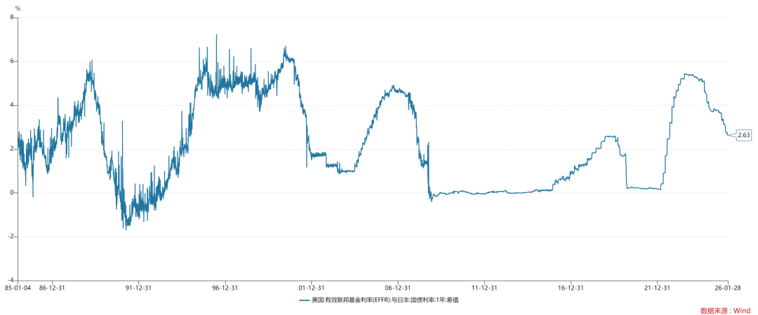 如上图所示,根据短端利率平价原理,我们用美日短债利差估算了日元对美元的掉期点e。1990年初日本股市见高点,然后,日本经济的问题陆陆续续爆发出来。之后日本开始“降息缩表”和刮骨疗毒,在1995年8月美日短债利差上升到5.5%附近,这隐含了极高的日元掉期点e。于是,就有了所谓的“日本失去的三十年”。