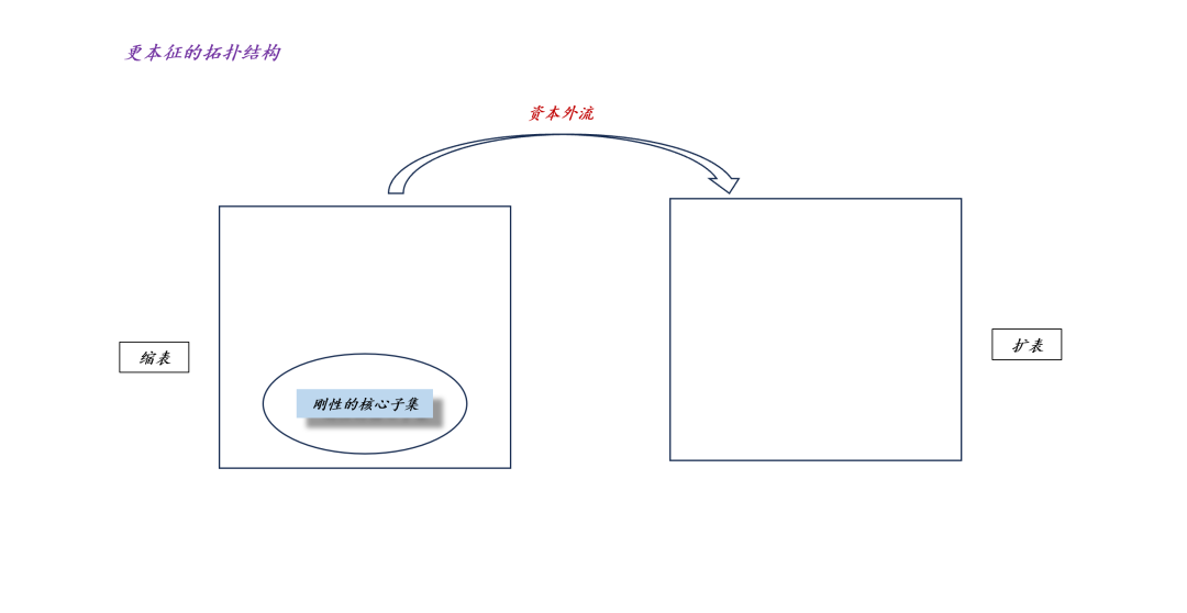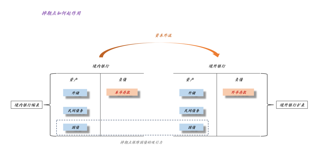 如上图所示,当本国银行体系降息时,资本外流,于是,境内银行将缩表,境外银行将扩表。然而,国债是整个体系核心,所以,我们要想办法保护它,让它具备刚性。