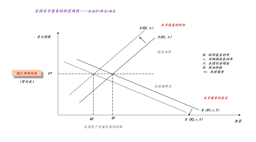 于是,我们就可以得到美国的本币债务的供需曲线,原油价格O替代了掉期点e,在这里,我们要做一个小心的区分: